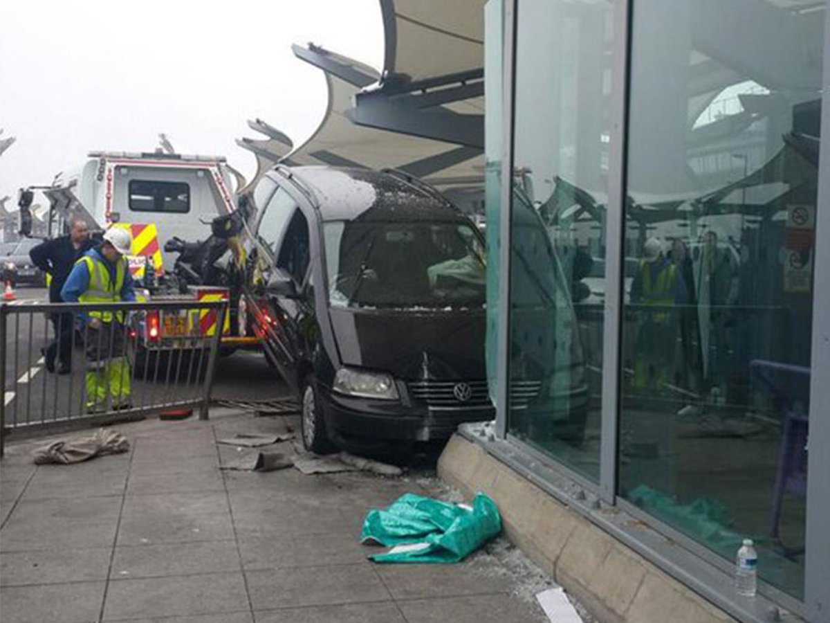 A Taxi driver has crashed into the side of Heathrow Terminal 5 'after suffering heart attack.